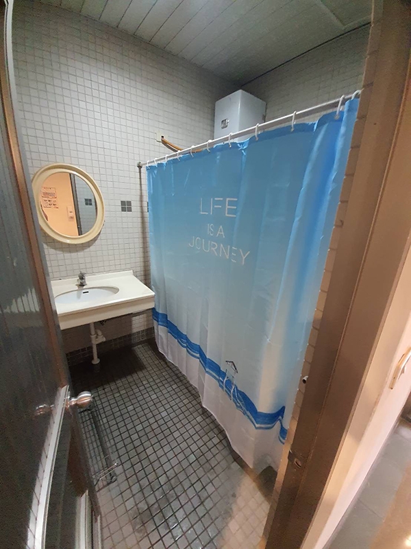 浴室內的置物籃跟浴簾